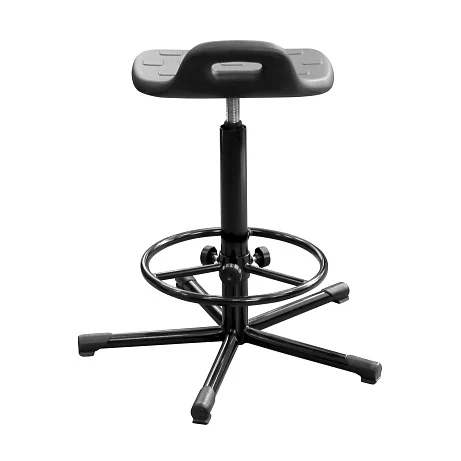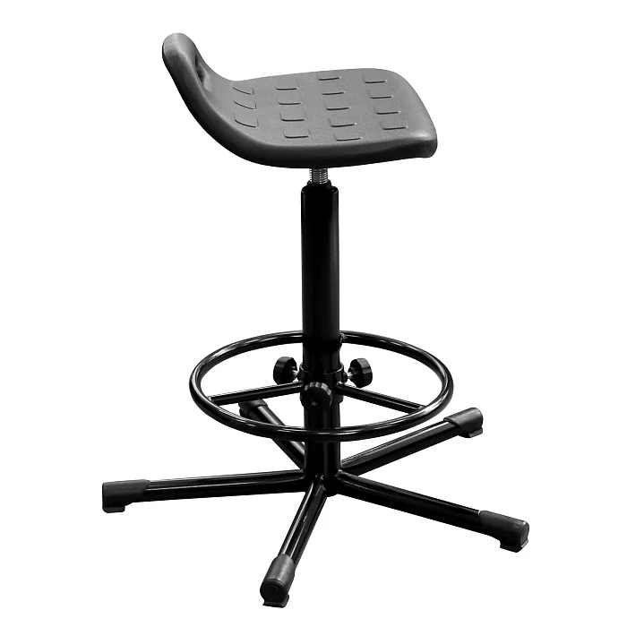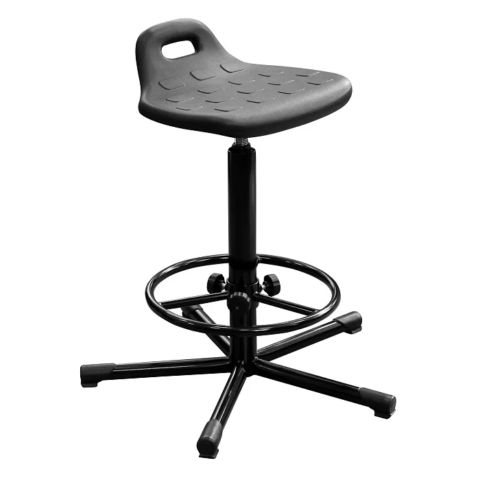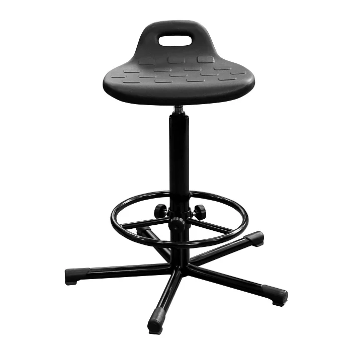 Табурет лабораторный Т09 с полиуретановым сиденьем и отверстием для руки — практичное решение для лабораторий, медицинских и учебных помещений, производственных участков, офисов и других зон, где важны износостойкость и удобная посадка. Модель рассчитана на работу со столами высотой от 810 мм: высота сиденья плавно регулируется надёжной винтовой опорой, а регулируемое кольцо-упор для ног помогает комфортно расположиться при длительной работе.