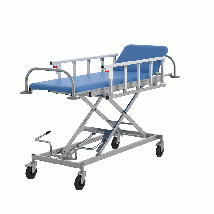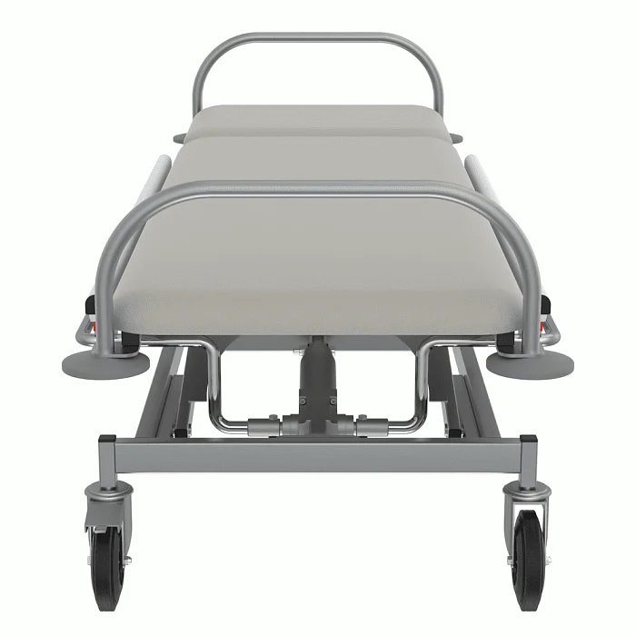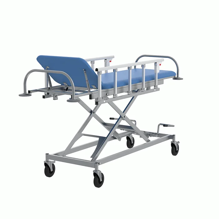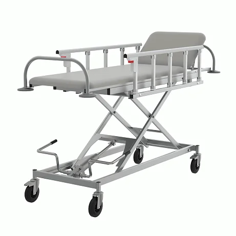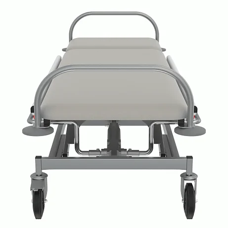 Каркас производится из прямоугольных стальных труб, покрытых полимерно-порошковой краской. Ложе и подголовник создаются из прочной фанеры и пенополиуретана. Они обтягиваются бежевой искусственной кожей. Высота тележки регулируется при помощи гидравлического привода.