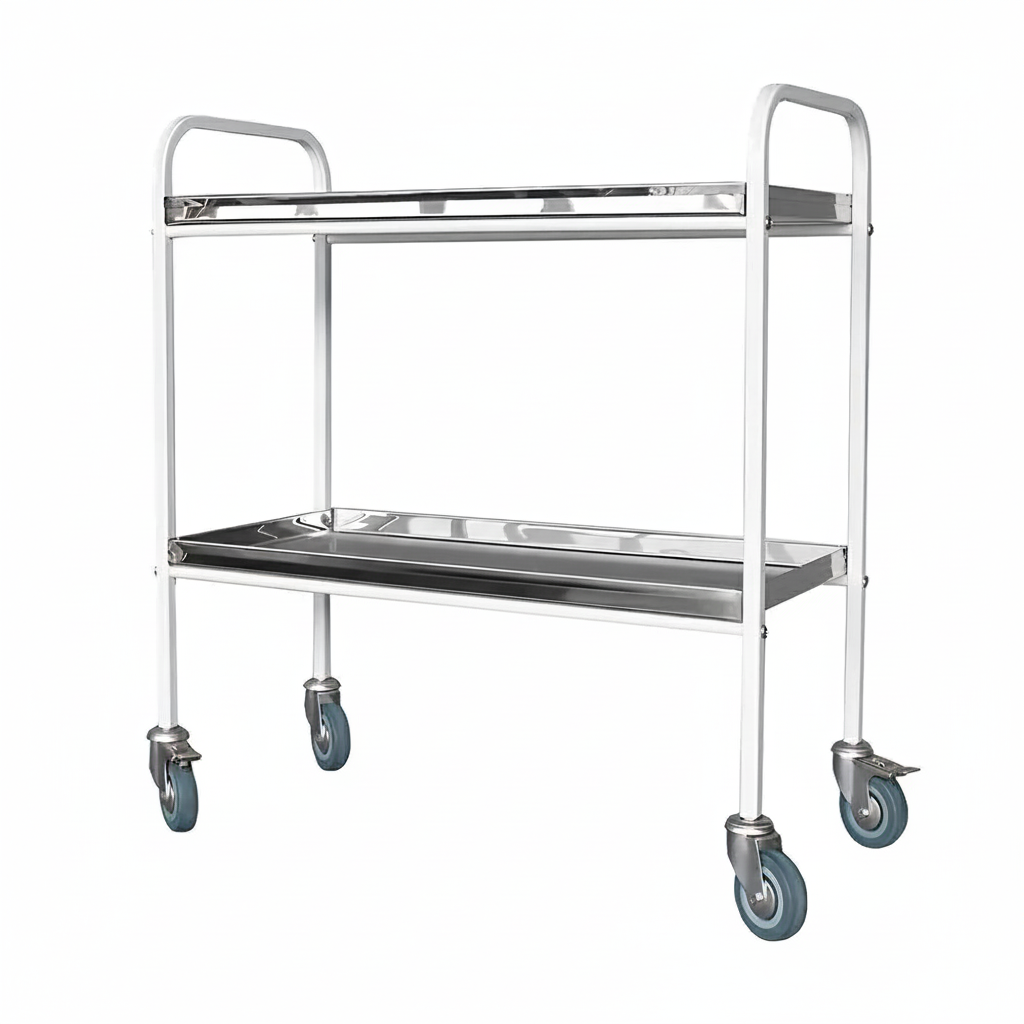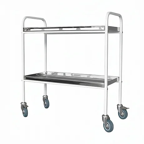Конструкция продумана просто и честно: металлический каркас с защитным полимерно-порошковым покрытием и две вместительные полки с бортиками. Такой набор закрывает большинство задач — от доставки стерильных комплектов до развоза расходников и медикаментов при проведении лечебных процедур и обследований.