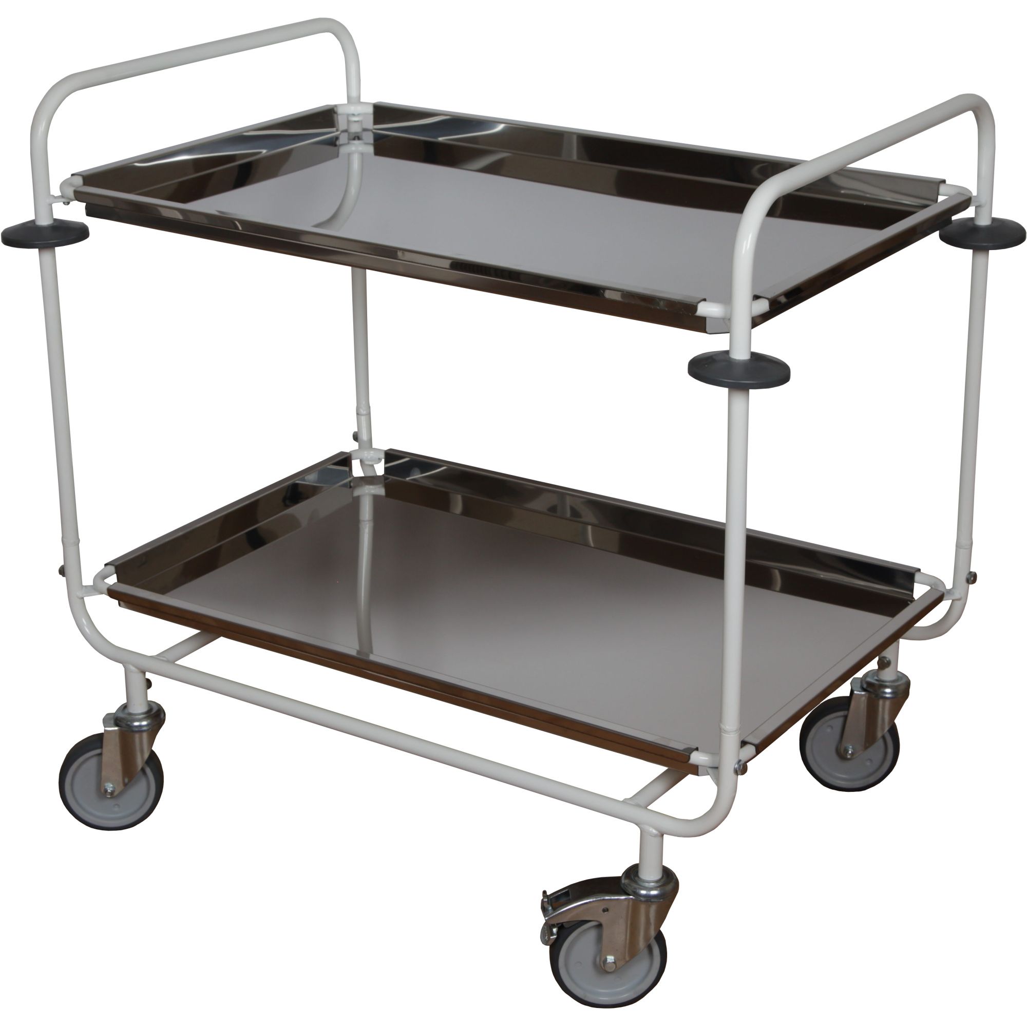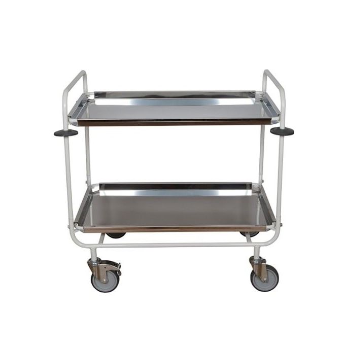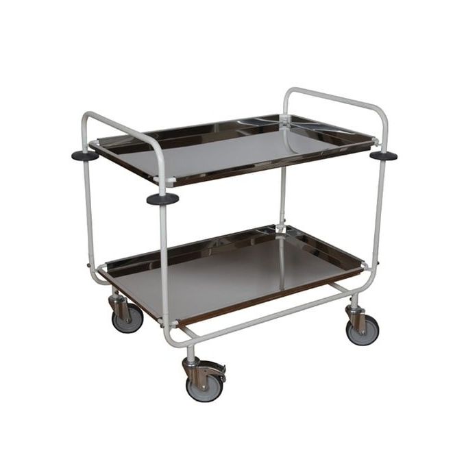 Тележка ТПП-1 предназначена для внутрикорпусной транспортировки пищи и сбора грязной посуды. Применяется в медицинских учреждениях. Каркас - сварной, выполнен из стальных труб круглого сечения с нанесением экологически чистого полимерно-порошкового покрытия, устойчивого к многократной обработке дезинфицирующими растворами, применяемыми в медицине. Две полки - съемные, изготовлены из нержавеющей стали AISI 304 (толщина 1 мм). Высота бортов - 30мм. Для удобства перемещения тележки по лечебному заведению, по боковым сторонам тележки, предусмотрены ручки. Угловые роликовые бамперы - пластмассовые, диаметром 100 мм. Основание тележки установлено на 4 самоориентирующиеся колеса "TENTE" (Германия), диаметром 125 мм, 2 колеса с тормозным устройством. Изделие поставляется в собранном виде в гофрокартонной упаковке и/или в деревянной обрешетке. Гарантийный срок 24 месяца.