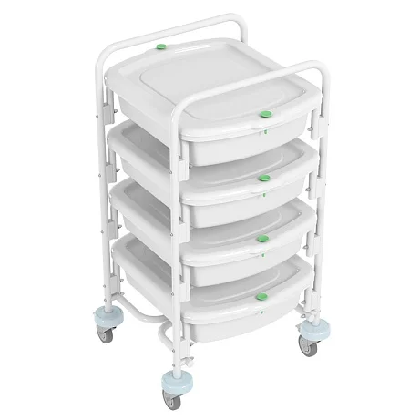 Каркас тележки производится из стальной трубы, обладающей круглым сечение. Металл покрывается качественной порошковой краской, которая защищает его от коррозии, внешних механических воздействий и влияния химически активных чистящих средств. Изделие состоит из 4-х ярусов, дополненных контейнерами. Максимальная нагрузка на контейнеры составляет 10 кг. Емкости производятся из полимерных материалов.