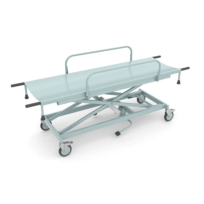 Изменение высоты ложа осуществляется с помощью гидравлического привода, который приводится в действие ножной педалью. Это решение особенно удобно в повседневной работе медицинского персонала: регулировка выполняется быстро, плавно и без значительных физических усилий. Высота изменяется в диапазоне от 500 до 940 мм, благодаря чему каталку можно подстроить под рост сотрудника, особенности помещения и задачи конкретной манипуляции.