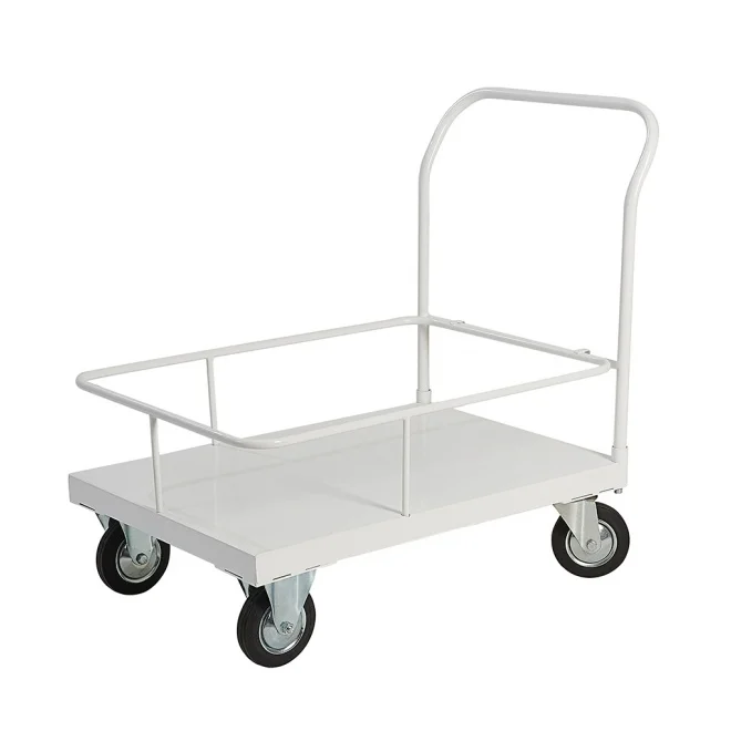 Тележка межкорпусная ТМГ-01 МСК-509 позволяет перемещать грузы с достаточно большим весом. Для этого в ее конструкции предусмотрена очень прочная поверхность для установки транспортируемых предметов. Для фиксации их положения предусмотрен простой бортик. Перемещается тележка на 4 колесах, которые вращаются вокруг собственной вертикальной оси. Выдерживает тележка нагрузки до 400 кг. Ее металлическая поверхность окрашена порошковой краской.