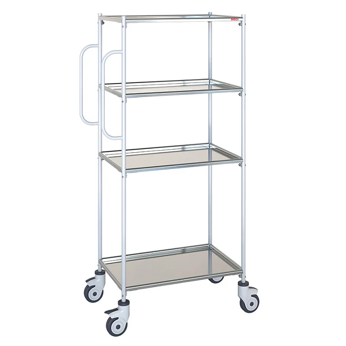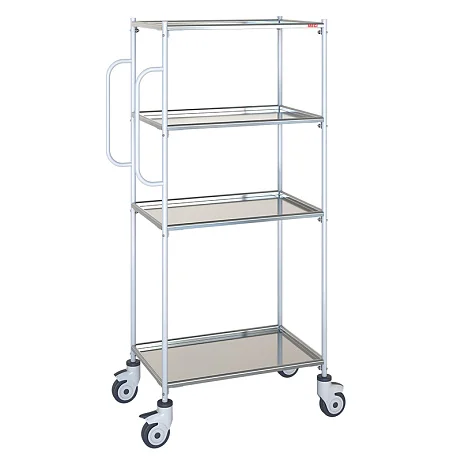 Тележка-стеллаж ТВи-02 МСК-522 — это удобная и универсальная конструкция. В ней предусмотрено 4 полки. Они сделаны из нержавеющей стали. Перемещается тележка на 4 колесах. Они вращаются вокруг вертикальной оси. Чтобы положение тележки можно было зафиксировать, 2 колеса оснащены тормозами. Сбоку в каркасе предусмотрены ручки, чтобы перемещать тележку было удобней. Полки в стеллаже снимаются и устанавливаются на каркас. На каркас тележки, изготовленный из металлической трубы, нанесено полимерное покрытие.