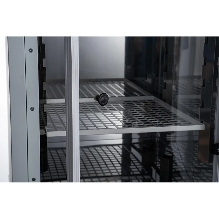 Корпус выполнен из металла с порошковым покрытием — решение, устойчивое к истиранию и ежедневной дезинфекции. Внутренняя камера изготовлена из нержавеющей стали и оснащена вентилятором для поддержания направленной циркуляции. Стеклянная внутренняя дверь обеспечивает визуальный контроль без нарушения режима, снижая тепловые потери при наблюдении.