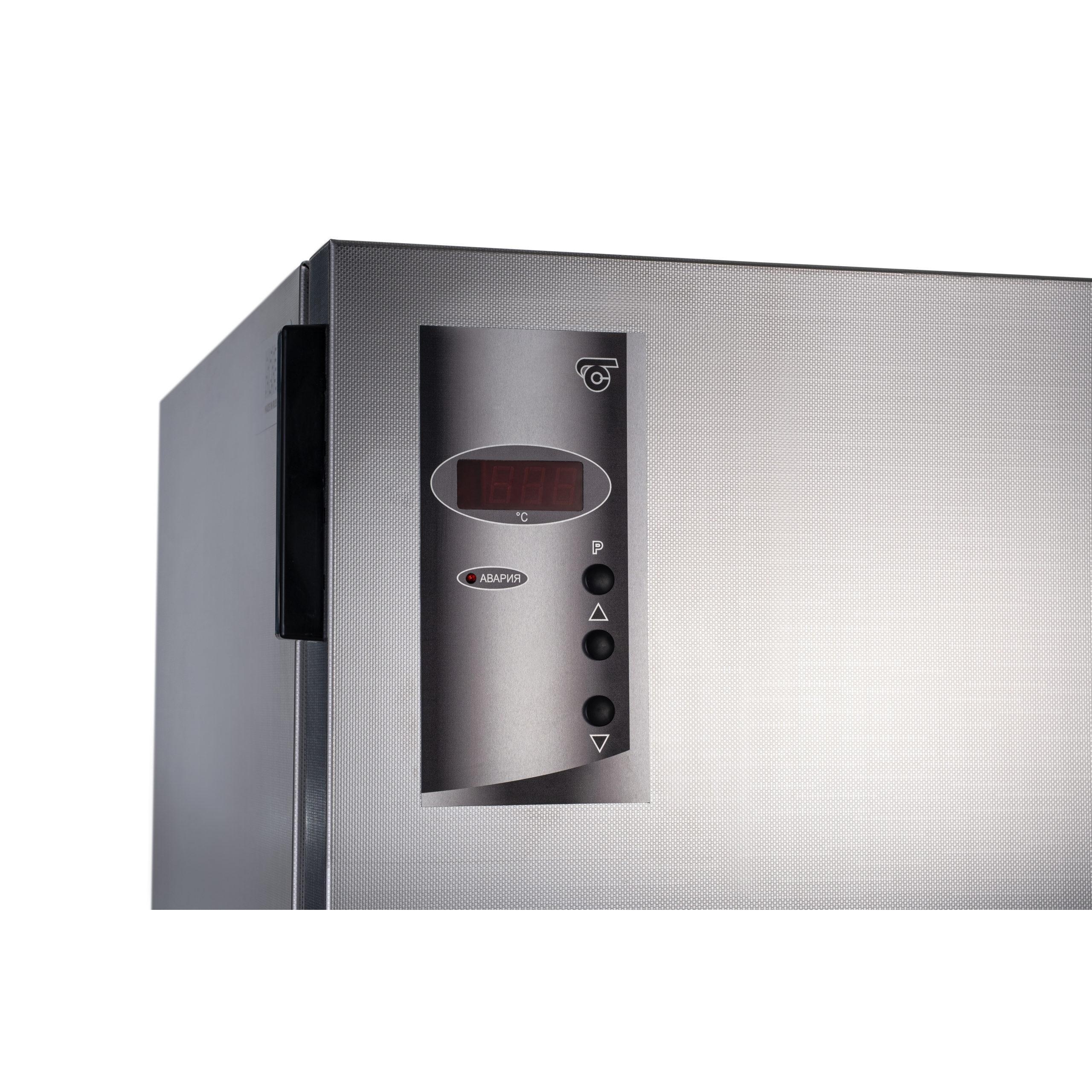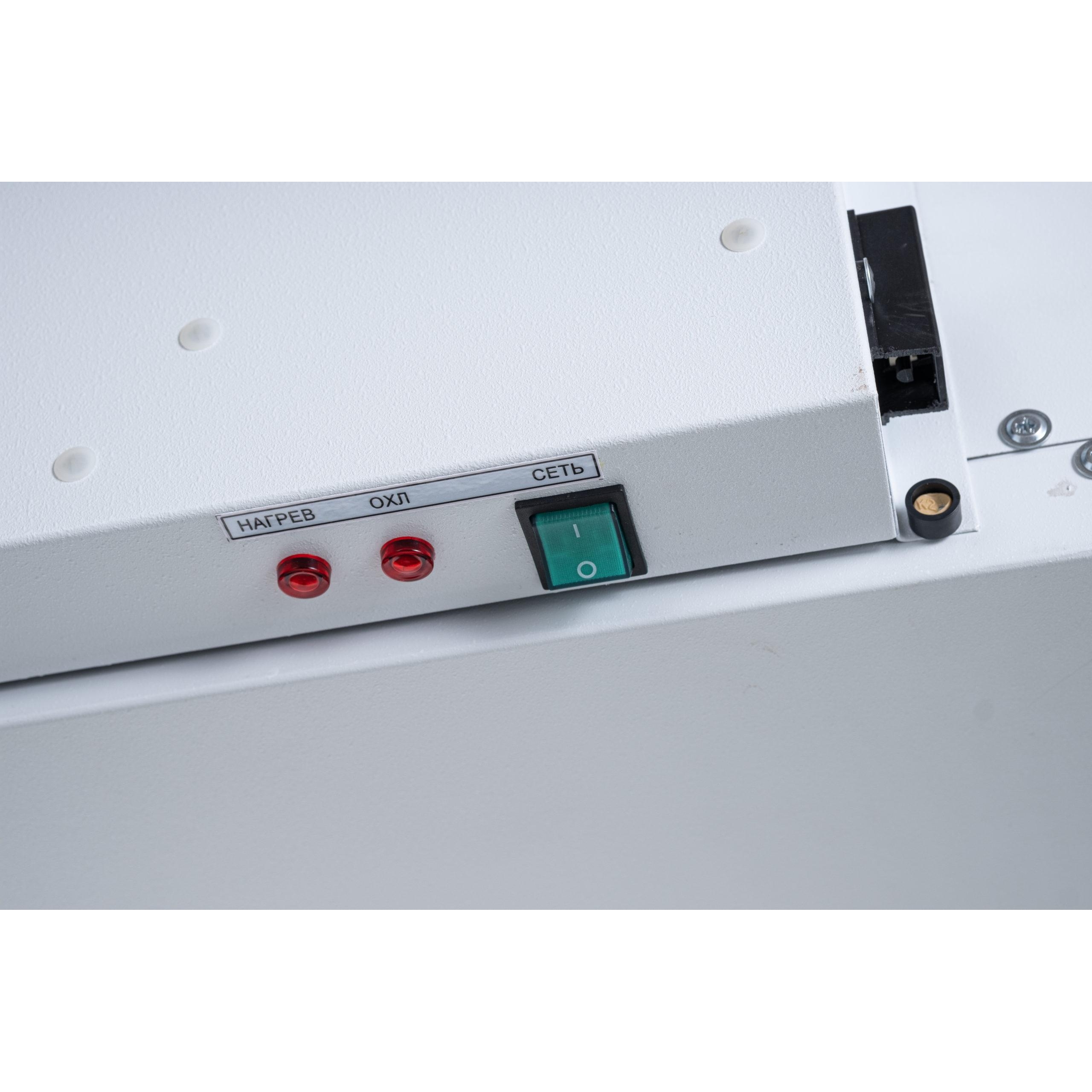Панель управления оснащена цифровым табло. Светодиодная индикация подсказывает текущую фазу работы: нижний индикатор активен при повышении температуры и запуске нагревателя, верхний — при снижении температуры и включении системы охлаждения. Низкошумный вентилятор обеспечивает равномерное перемешивание воздушных масс и быстрый выход на заданный режим.