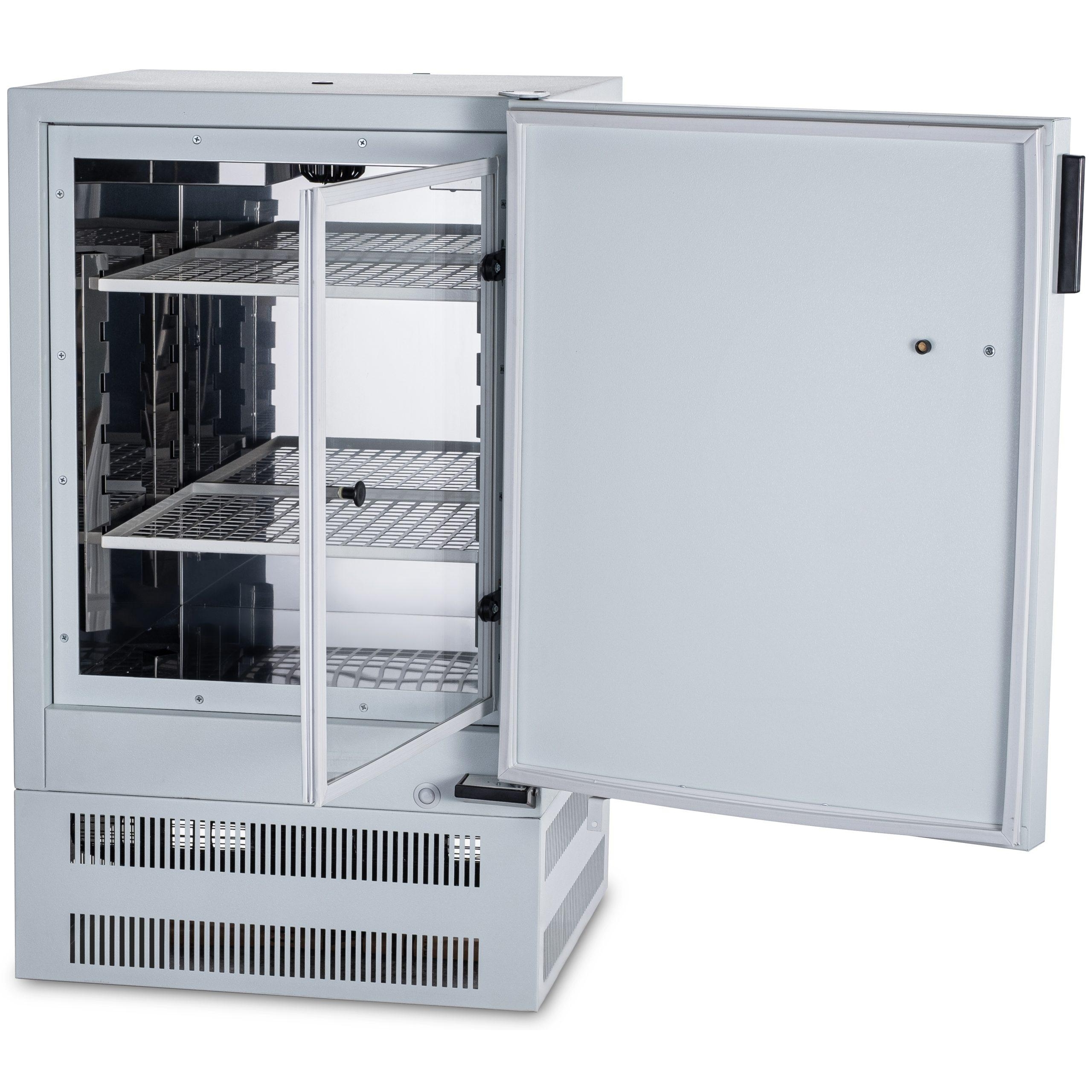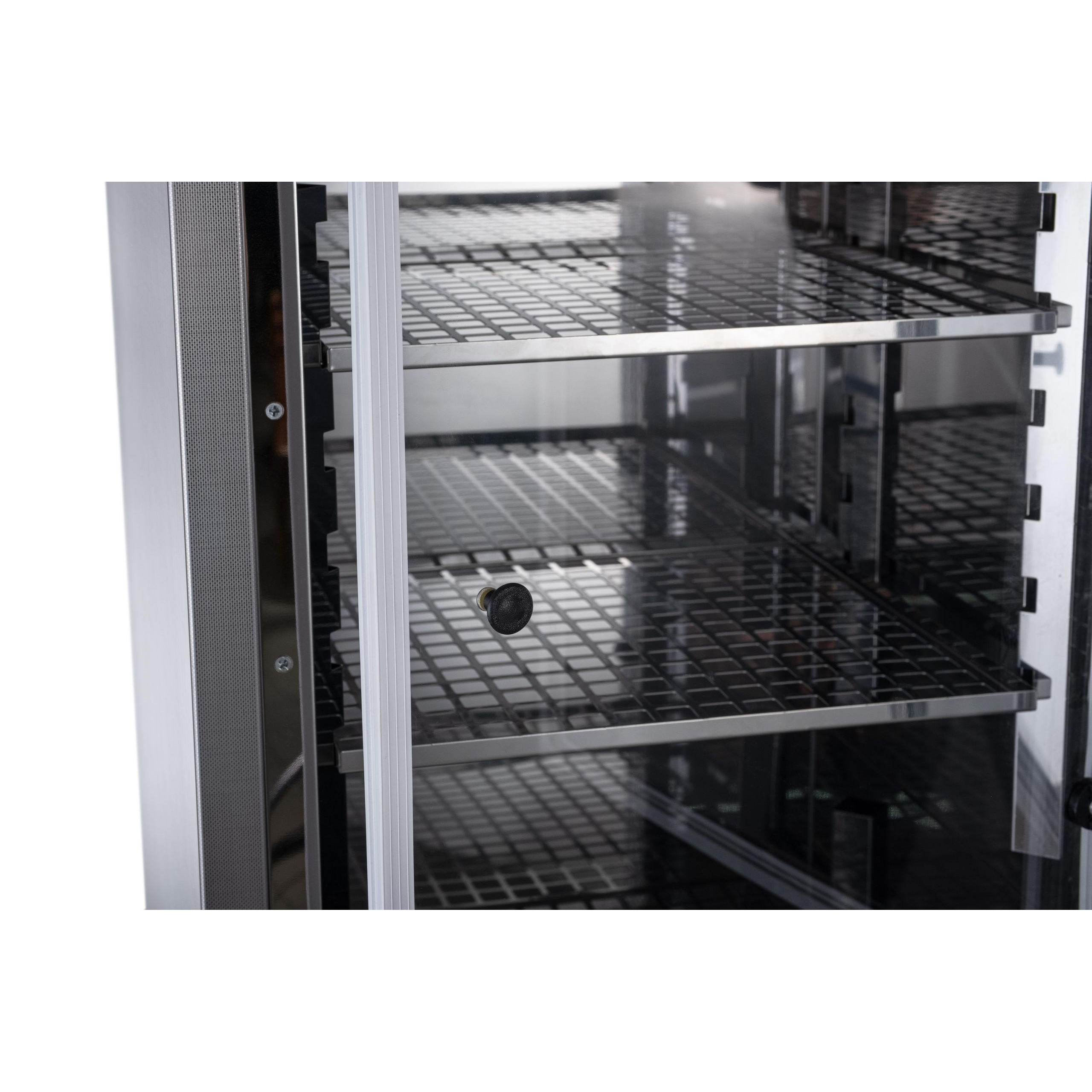 В стандартный комплект входят две решетчатые вставные полки из стали с защитным покрытием. Конструкция полок обеспечивает свободную циркуляцию воздуха вокруг образцов и гибкую организацию полезного объема. Питание — от сети переменного тока.