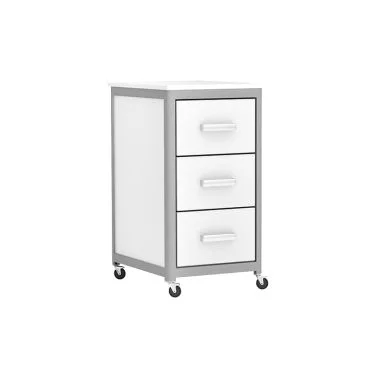 Тумба лабораторная АСК ТЛп.03.00 Стандарт базируется на алюминиевом каркасе, детали тумбы выполнены из светлого ЛДСП. Мебель оборудована тремя выдвижными ящиками с хромированными ручками. Устанавливается на четыре колесных мебельных опоры. Столешница выполнена из МДФ и покрыта пластиком.