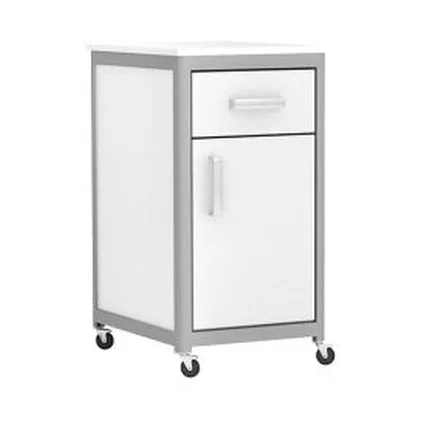 Тумба стационарная лабораторная АСК ТЛп.05.00 Стандарт – разборная, устанавливается на мебельные колеса. Детали крепятся на алюминиевый травмобезопасный каркас. Сама тумба выполнена из ЛДСП светло-серого цвета, столешница покрыта бумажно-слоистым пластиком. Тумба имеет выдвижной ящик и отделение с полкой и дверкой с хромированной ручкой.