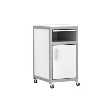 Тумба лабораторная АСК ТЛп.09.00 Стандарт белого цвета представляет собой разборную конструкцию, установленную на колеса. Такая мебель используется в лабораториях различных учреждений. Изготовлена из ЛДСП, столешница выдвижная и выполнена из МДФ. Тумба содержит одно отделение с полкой и дверкой с хромированной ручкой и открытую нишу под столешницей.
