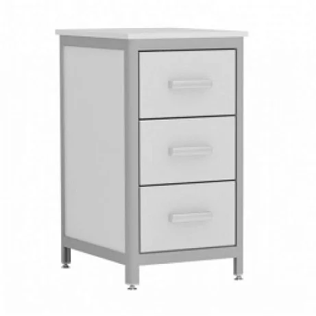 Тумба лабораторная АСК ТЛс.03.00 Стандарт на алюминиевом каркасе и регулируемых опорах. Изготовлена из белого ЛДСП, столешница сделана из ламинированного МДФ с покрытием бумажно-слоистым пластиком высокого давления, в тумбе есть три выдвижных ящика с хромированными ручками.