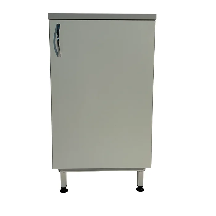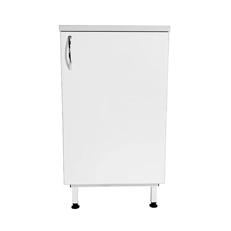 Тумба также оснащена ручкой-скобой хромированного цвета длиной 96 мм для удобного открытия дверцы. Для компенсации неровностей напольного покрытия на ножках предусмотрены четыре регулируемые по высоте опоры высотой 100 мм, обеспечивая стабильность и уровень конструкции.