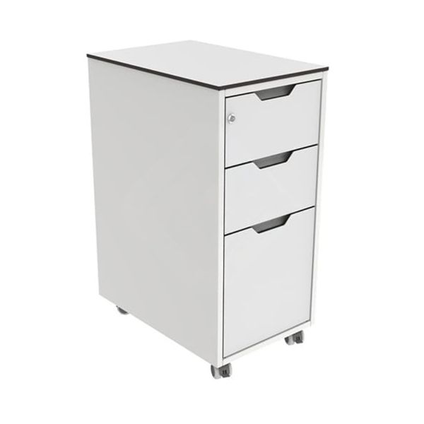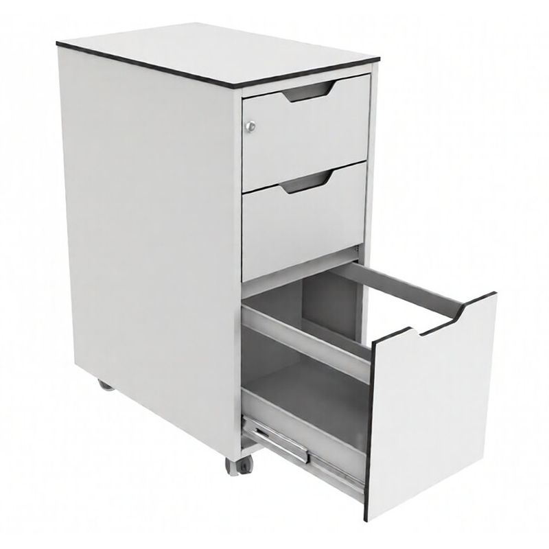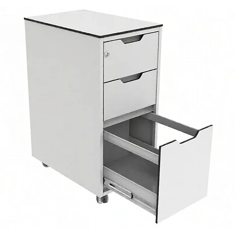Тумба оснащена тремя выдвижными ящиками на телескопических направляющих — ход плавный и свободный, без «заеданий» при нормальной загрузке. Нижний ящик увеличенной вместимости — это заметный плюс для кабинетов, где приходится хранить коробки с расходниками, пакеты для стерилизации, перевязочные наборы и другую объемную номенклатуру.