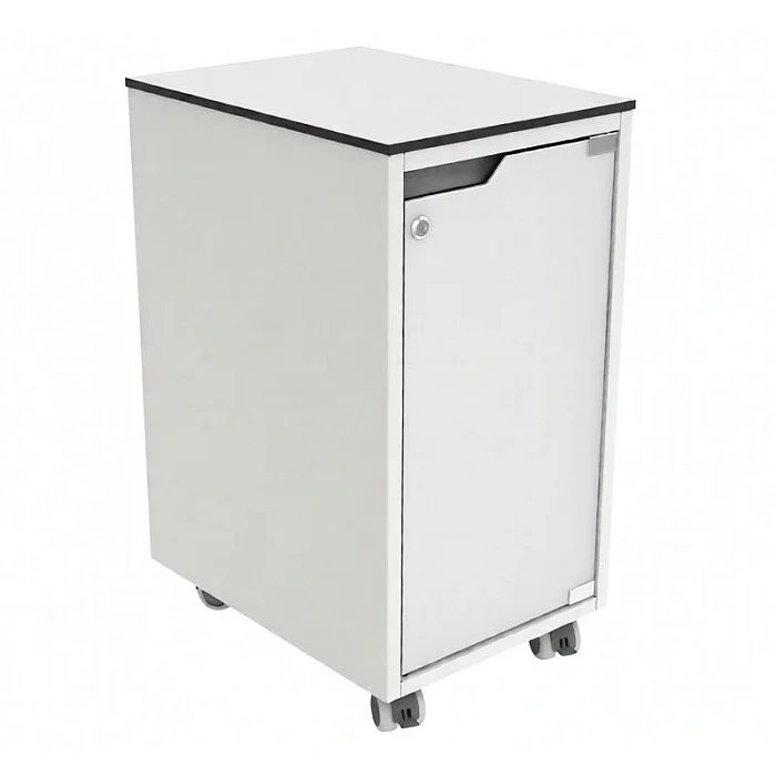 Ручка выполнена в виде трапецеидального выреза в верхней части фасада и не выступает за габариты. Это удобно в узких проходах и у рабочих столов: тумба не цепляется за одежду, провода и края мебели, а фасад выглядит цельно.