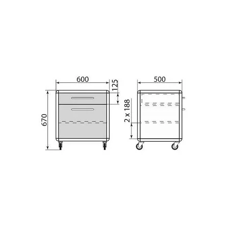 Тумба установлена на колеса Ø75 мм из термопластичной резины — материал не оставляет следов на покрытии и помогает перемещать тумбу мягко, без резких рывков. Два задних колеса оснащены тормозом: можно зафиксировать тумбу у кушетки, процедурного стола или в зоне подготовки, чтобы она не «уезжала» в момент работы.