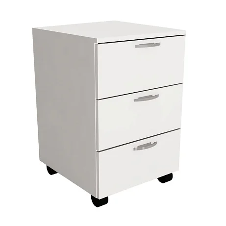 Тумба оснащается 3-мя выдвижными ящиками на направляющих. Конструкция создается из ЛДСП толщиной 16 мм. В основании находятся 4 самоориентирующихся мебельных колеса.