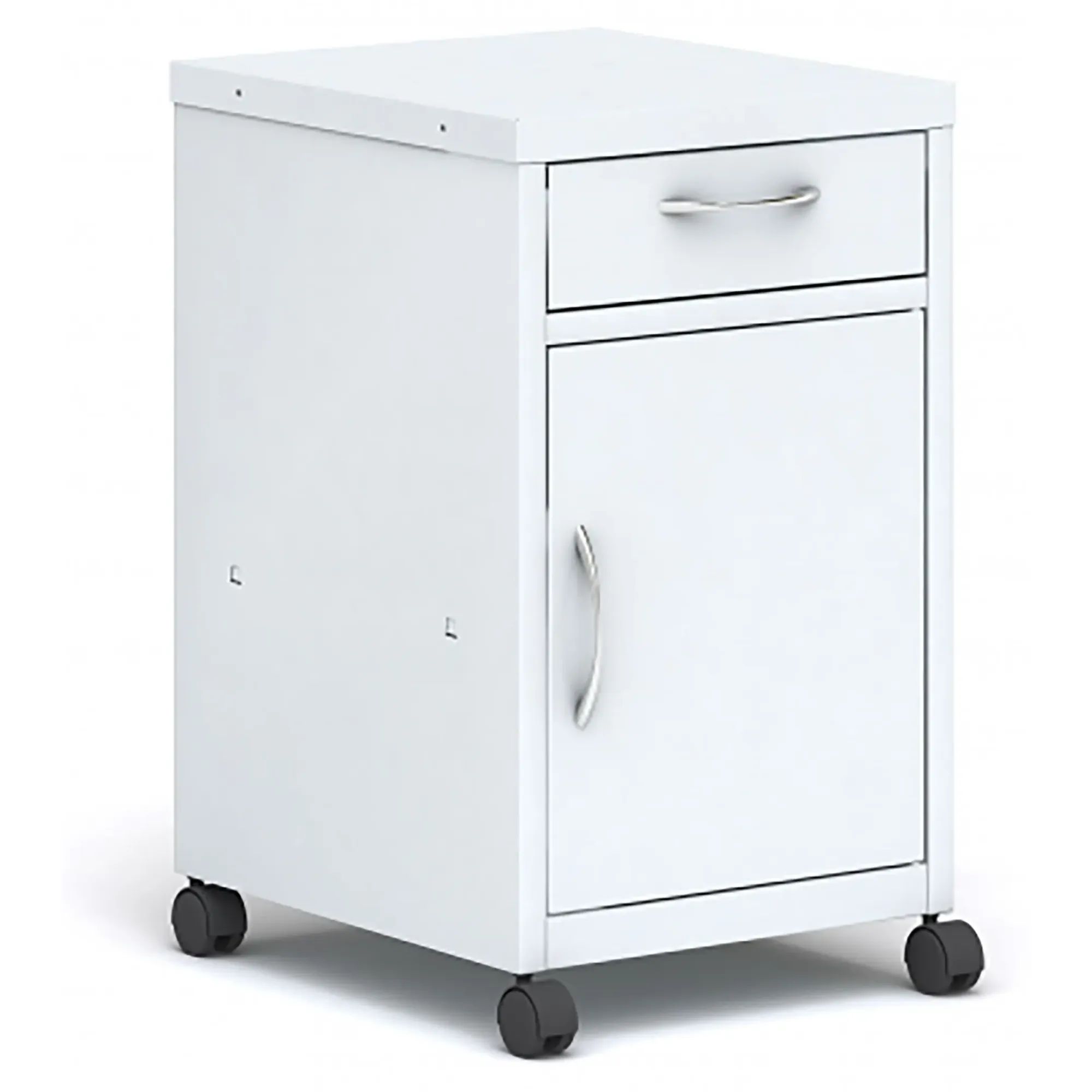 ПАКС ТП-1 представляет собой медицинскую тумбу. Модель рассчитана на хранение документов, медицинских препаратов, личных вещей, небольшого оборудования. Мебель прекрасно подходит для оснащения лечебно-профилактических заведений. Тумба рассчитана на применение в качестве приставного элемента для рабочих столов, кроватей. В конструкции предусмотрен выдвижной ящик, отсек с полкой, расположенной за закрытой дверцей. В качестве материала изготовления применяется листовая сталь толщиной 0.6 мм, на которую нанесено полимерно-порошковое покрытие. Столешница рассчитана на нагрузку в 25 кг. В качестве опор используются самоориентируемые колеса.