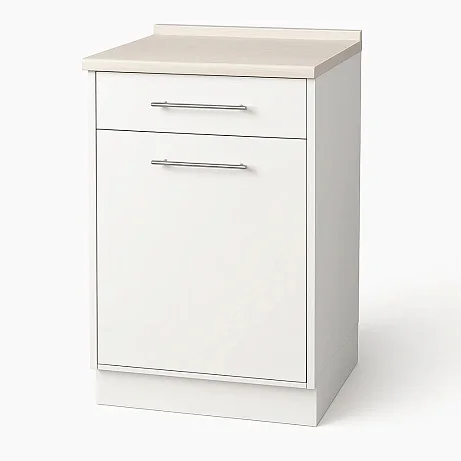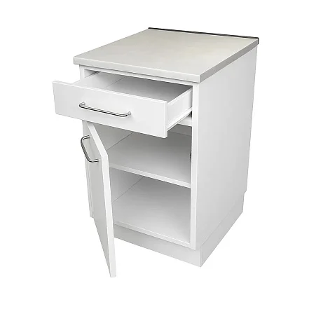 Белмедматериалы ТО1 (с ящиком, петли слева) представляет собой медицинскую тумбу, предназначенную для хранения личных вещей. Модель рассчитана на оснащение санаториев, больниц, гостиниц и так далее. В конструкции предусмотрен ящик, отсек с полкой за закрытой дверцей. Петли расположены с левой стороны. Для изготовления корпуса применяется металлическое полотно с полимерно-порошковым покрытием. Для изготовления столешницы используется постформинг, размер столешницы – 500х500 мм, толщина материала составляет 28 мм. В конструкции применяются пластиковые нерегулируемые опоры. Мебель поставляется в собранном виде.