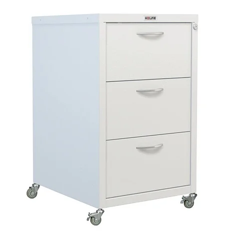 Тумба подкатная медицинская МД ТП-4 изготавливается из стали и служит для хранения документов, личных вещей и одежды медицинских сотрудников. Тумба оборудована тремя выдвижными ящиками на телескопических направляющих, которые закрываются на центральный замок. Каждый ящик выдерживает нагрузку до 15 кг. В качестве опор используются колеса, два из которых оснащены стояночным тормозом.