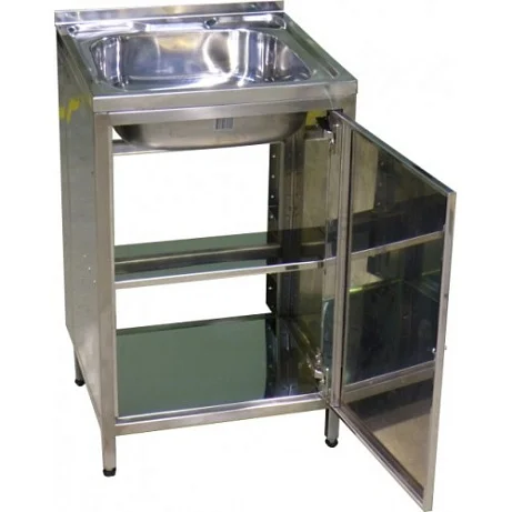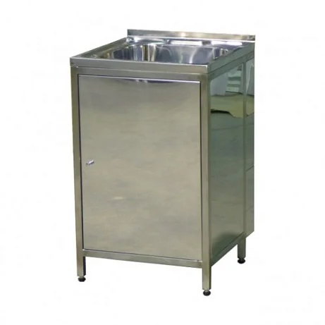 Тумба с одночашечной мойкой, изготовленной из высококачественной нержавеющей стали AISI 304. На торцевых стенках мойки предусмотрены съемные доборные элементы, которые обеспечивают легкий доступ для подключения сантехнических систем подачи воды и канализации. Тумба поставляется в собранном виде, что облегчает установку и использование.