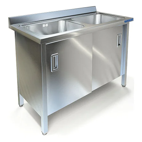 Корпус сварной из нержавейки 0,8 мм, внутри удобная полка для инвентаря, а раздвижные двери-купе экономят место на тесной кухне. Ножки с регулировкой высоты помогают выровнять прибор на неровном полу. В комплекте — сифон с переливом и нержавеющий выпуск с решёткой Ø90 мм (выход сифона Ø50 мм).