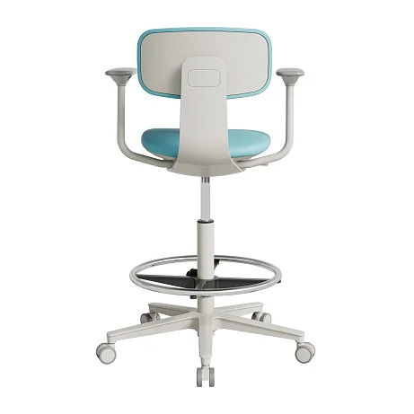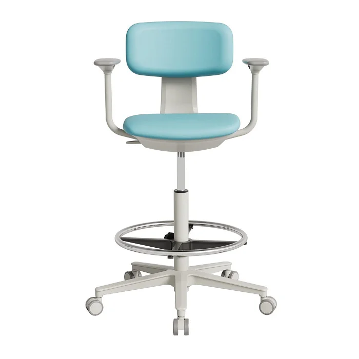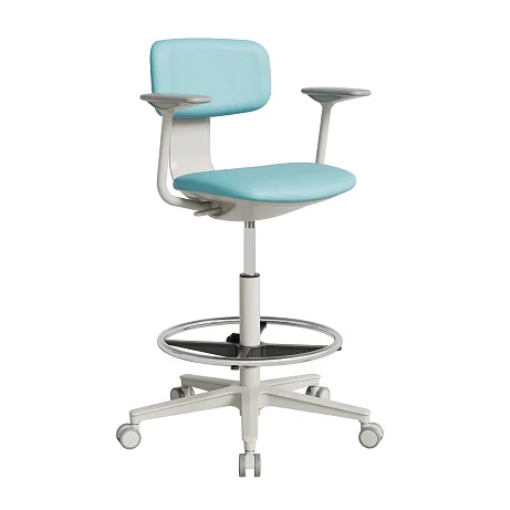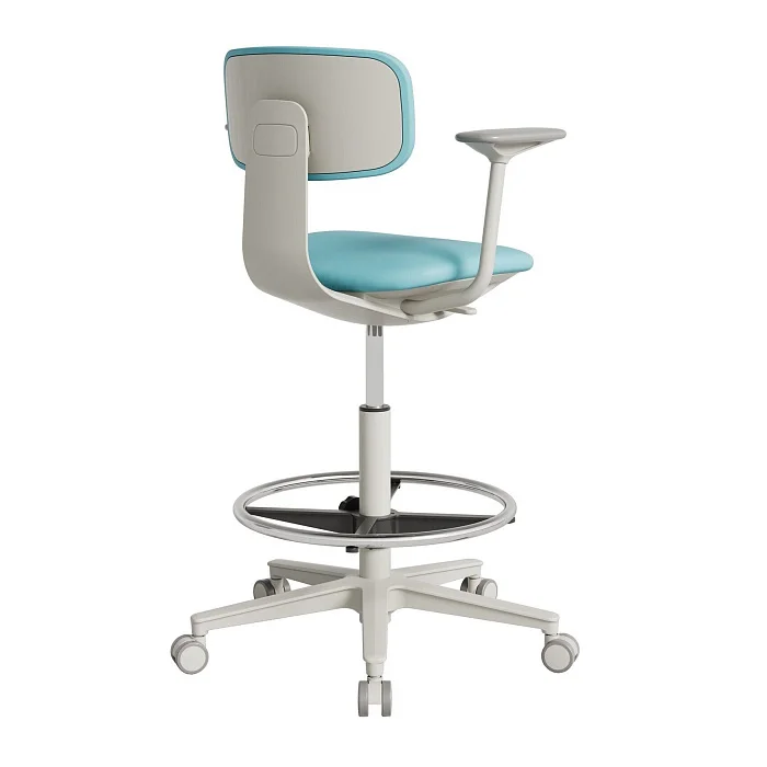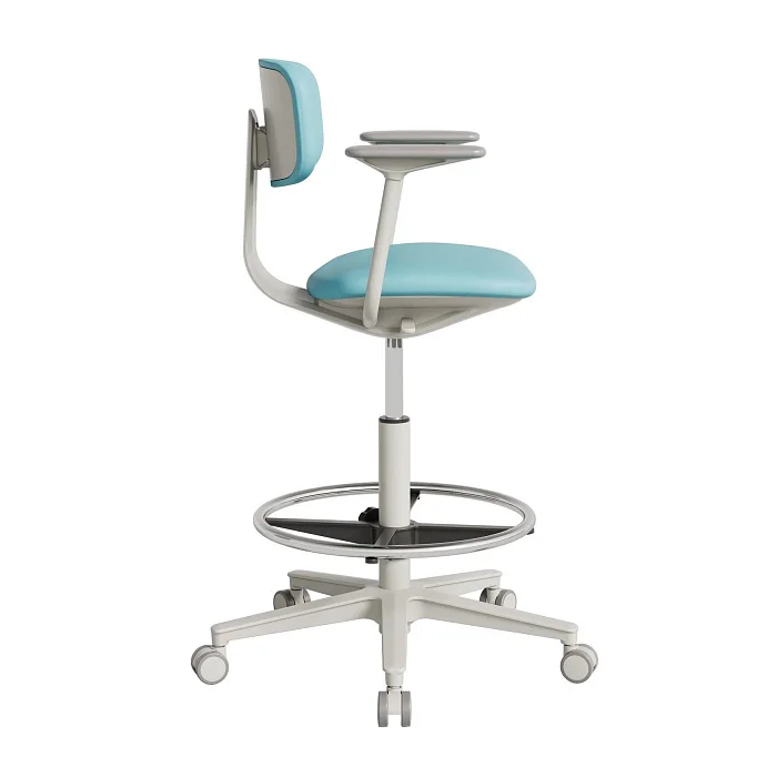 Модель рассчитана на рабочие поверхности высотой от 870 мм и выше — то есть на высокие столы в лабораториях, процедурных, сестринских постах, кабинетах врача, в амбулаториях и других функциональных зонах, где сотрудник регулярно меняет положение и работает «на высоте». За счет компактных габаритов кресло не «съедает» проходы и не конфликтует с оборудованием.