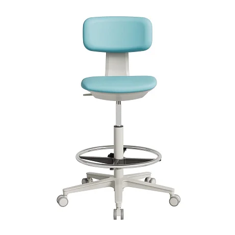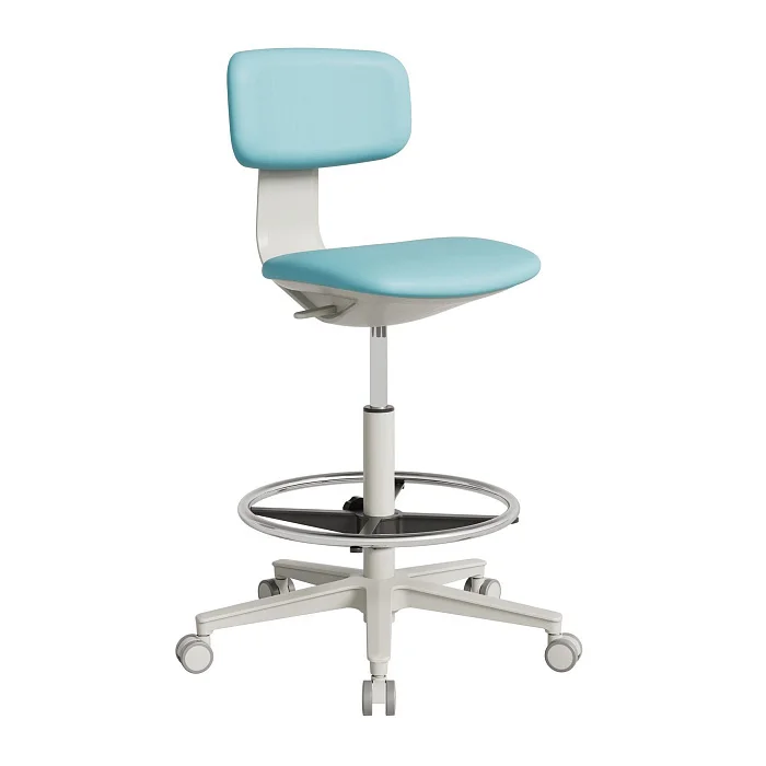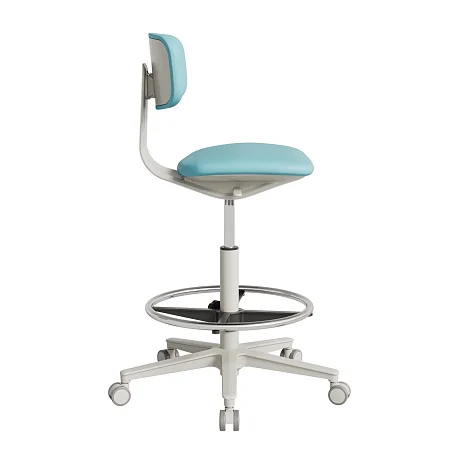 В стандартном исполнении кресло поставляется на пластиковых колёсных опорах — удобно для динамичной работы, когда требуется быстро подъехать к тумбе, столу или оборудованию. При необходимости можно выбрать комплектацию под конкретный кабинет и тип напольного покрытия.