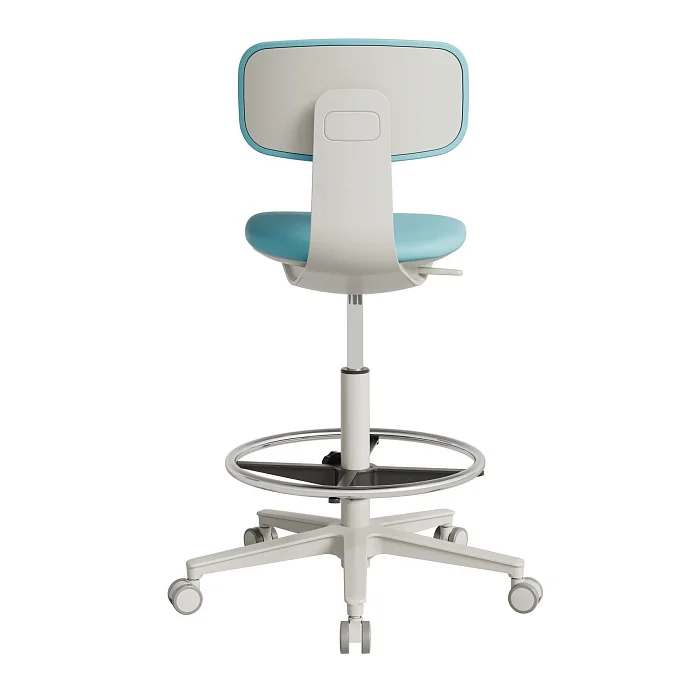 Сиденье и спинка обтянуты качественной экокожей голубого цвета, выполненной без швов. Это практичная деталь: швы — слабое место при частой уборке, а бесшовная поверхность быстрее и чище обрабатывается. Материал заявлен как водонепроницаемый, нетоксичный и устойчивый к УФ‑воздействию, что важно для помещений с интенсивным освещением и ежедневной обработкой.