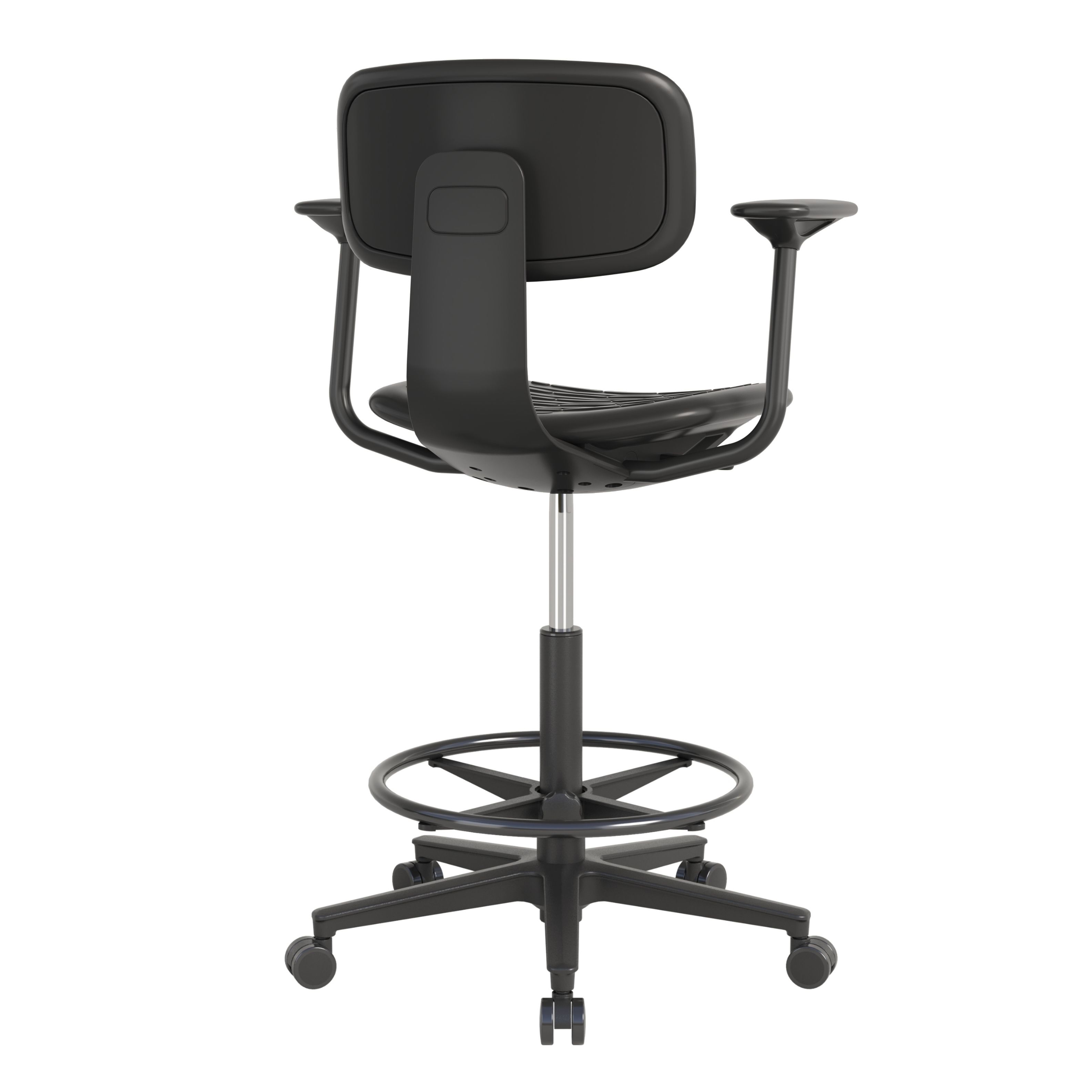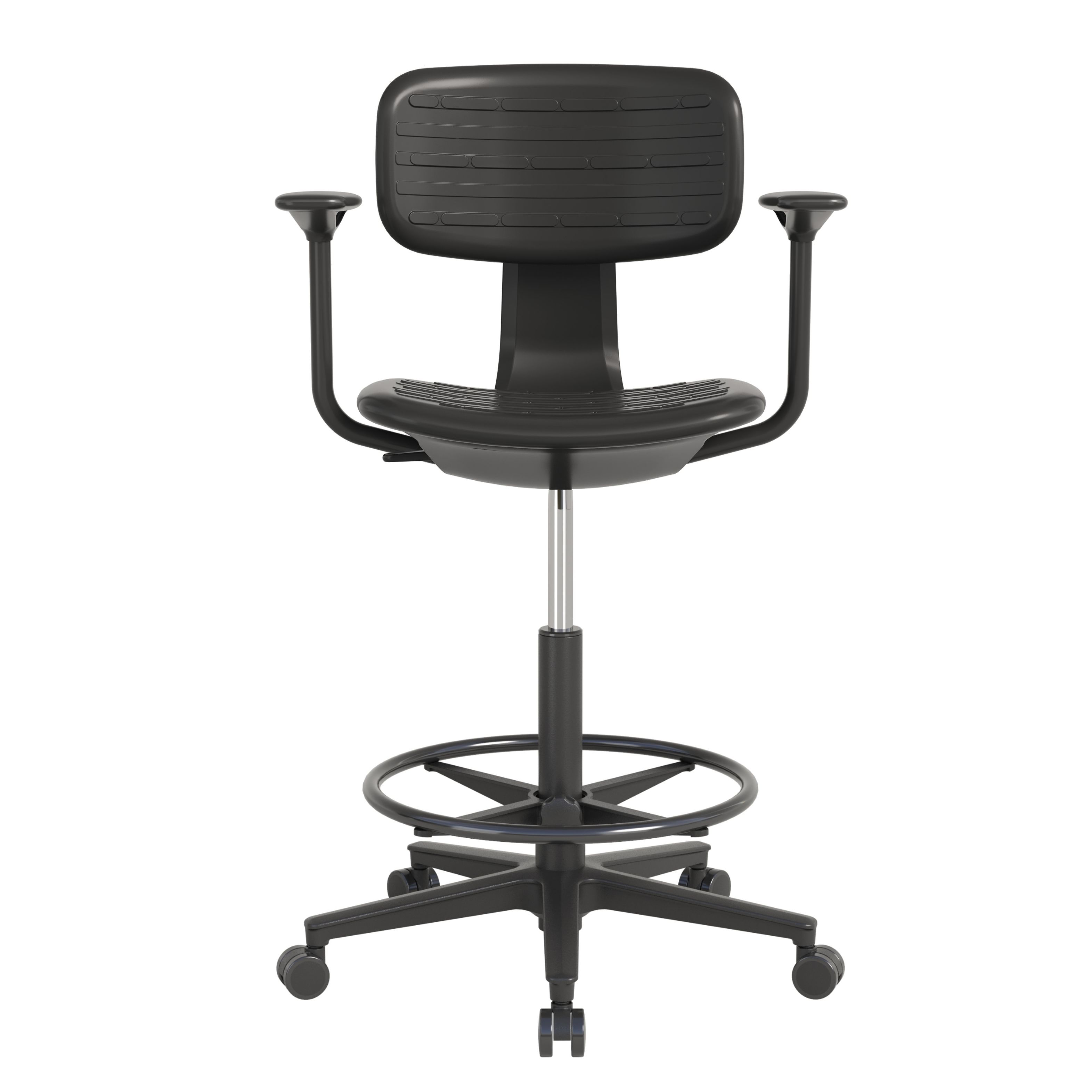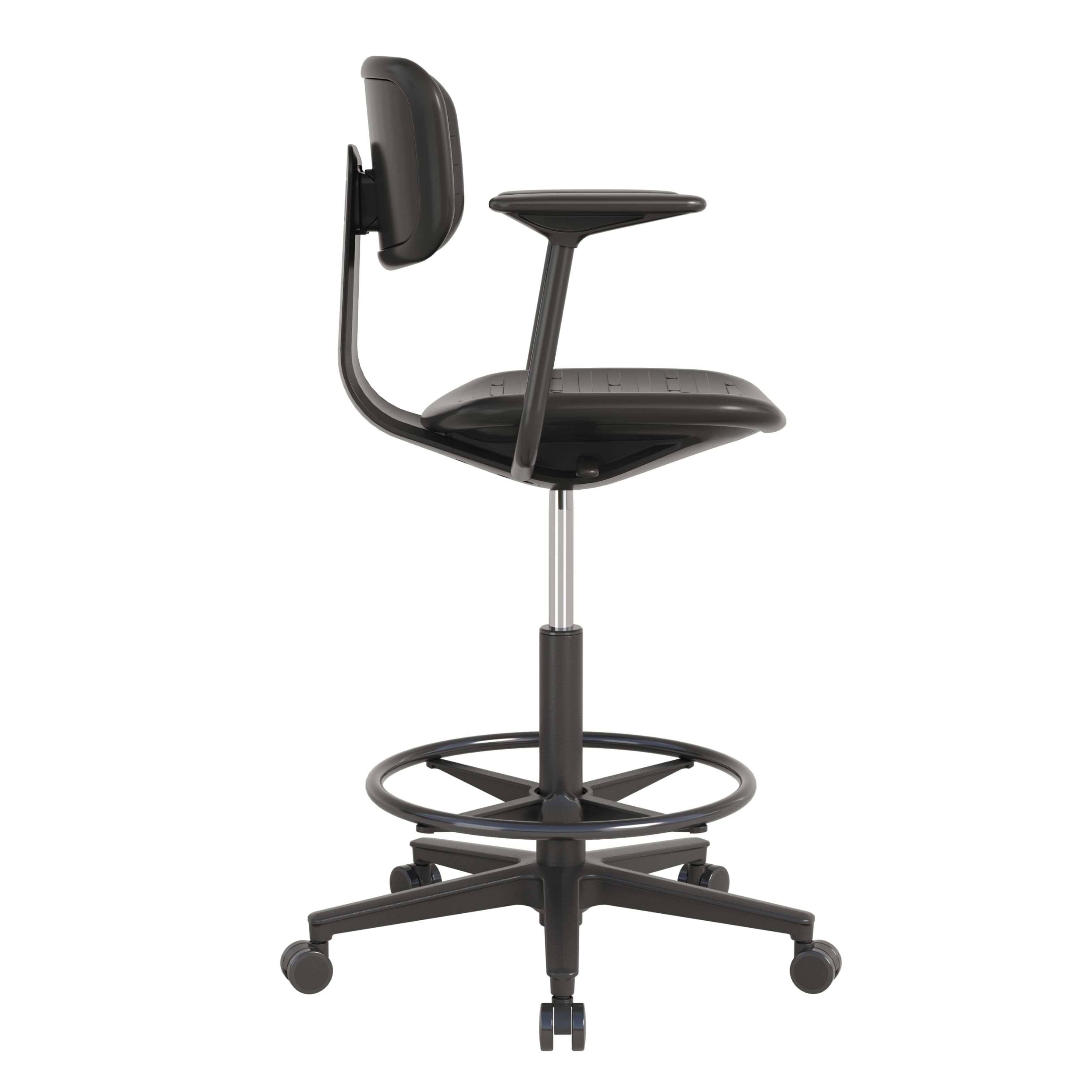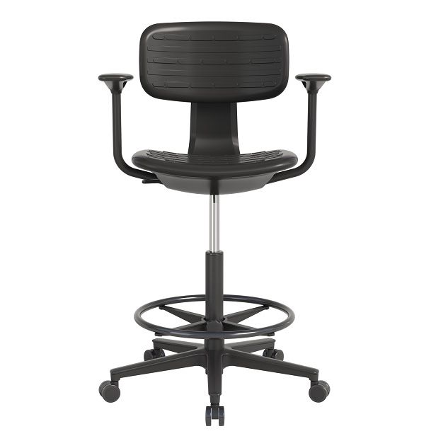 Когда рабочее место «высокое», основной дискомфорт обычно идёт от нагрузки на ноги и от вынужденной позы. Здесь решают сразу несколько элементов: подлокотники поддерживают руки при работе с инструментом/документацией, спинка помогает разгрузить поясницу, а регулируемое опорное кольцо даёт стабильную опору для стоп.