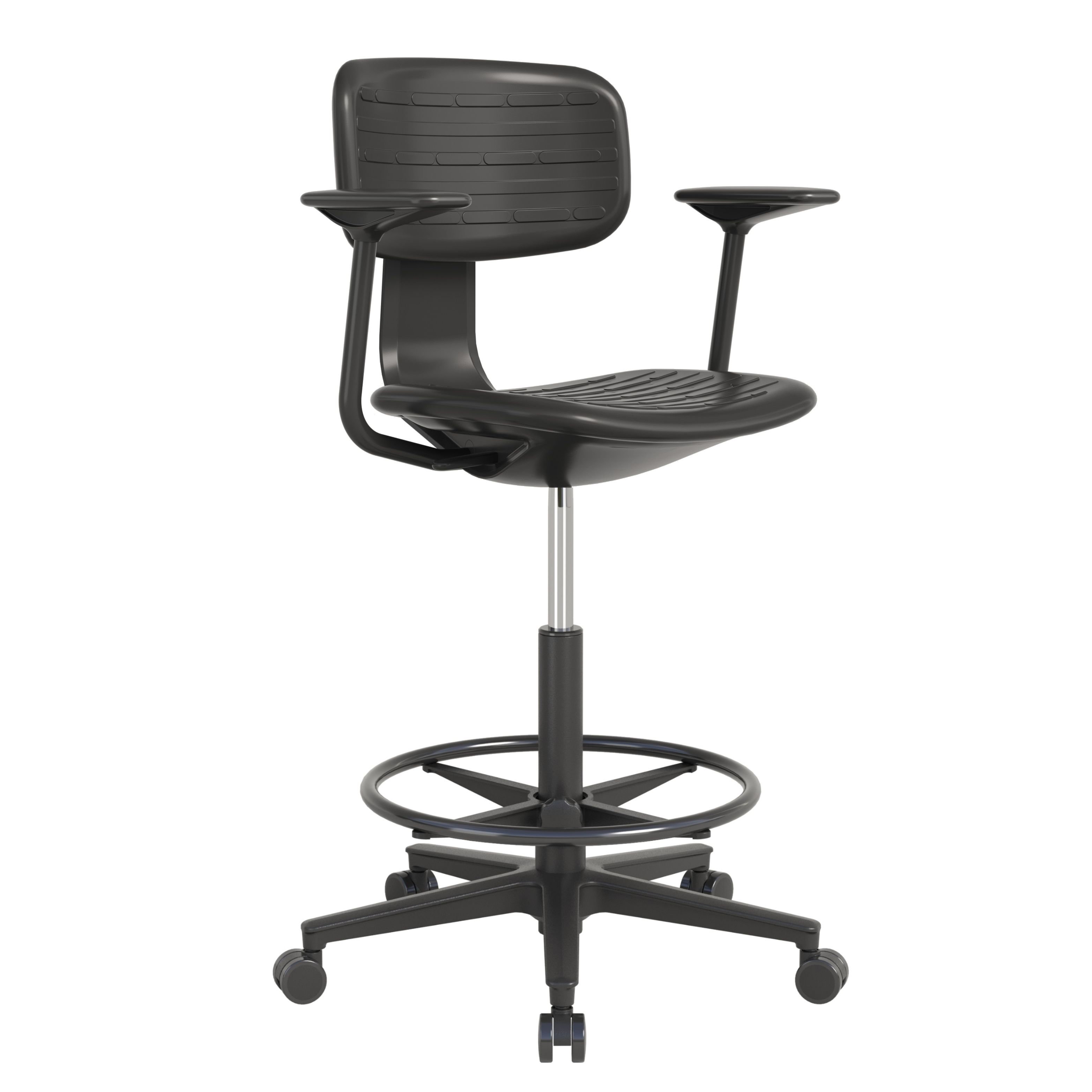 В базовой комплектации кресло поставляется на пластиковых колёсных опорах, с опорным кольцом для ног и подлокотниками — это универсальный вариант для динамичной работы у высокого стола.