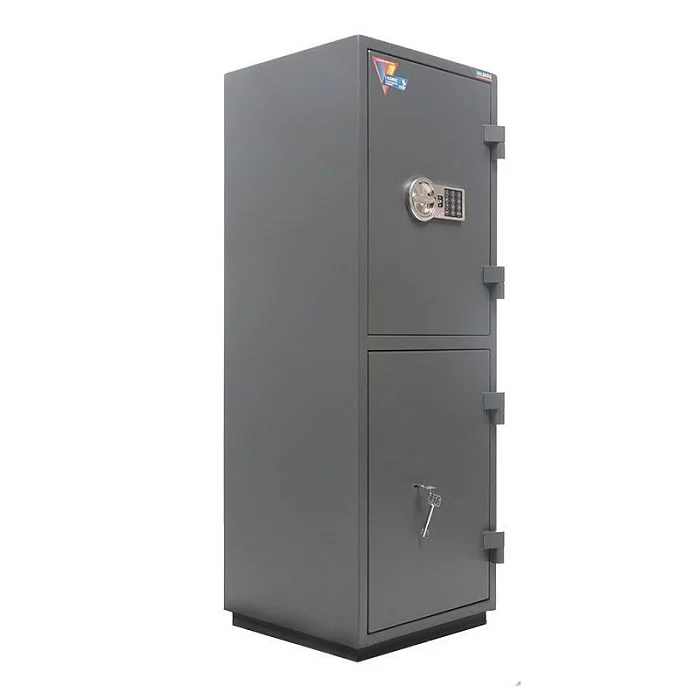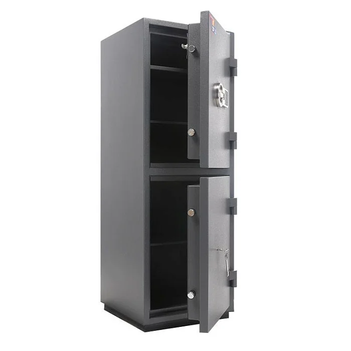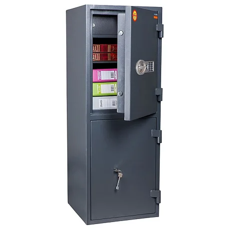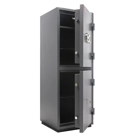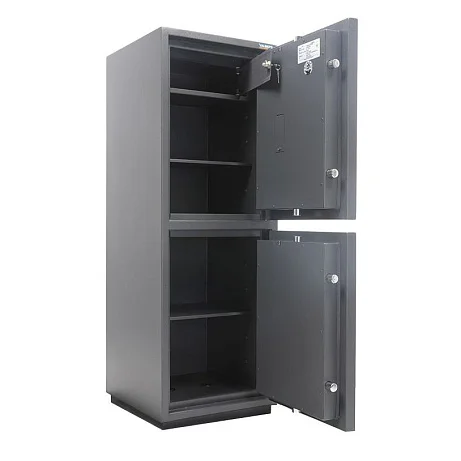 Сейф графитового цвета состоит из двух самостоятельных отделений, каждое из которых запирается отдельной дверью, соответственно, сейф может быть использован несколькими людьми. В нем удобно хранить важные документы и ценности, так как сейф надежно защищен от высверливания или выбивания замков. Верхняя дверь закрывается на кодовый электронный замок, нижняя – на ключевой замок. Самая выгодная цена на сейфы в магазине специализированной мебели МедМебель в Москве. Обратившись в этот магазин и заказав взломостойкий сейф, вам не надо будет думать, как его доставить.