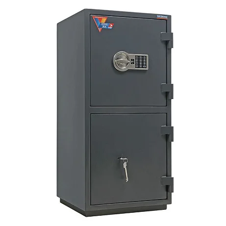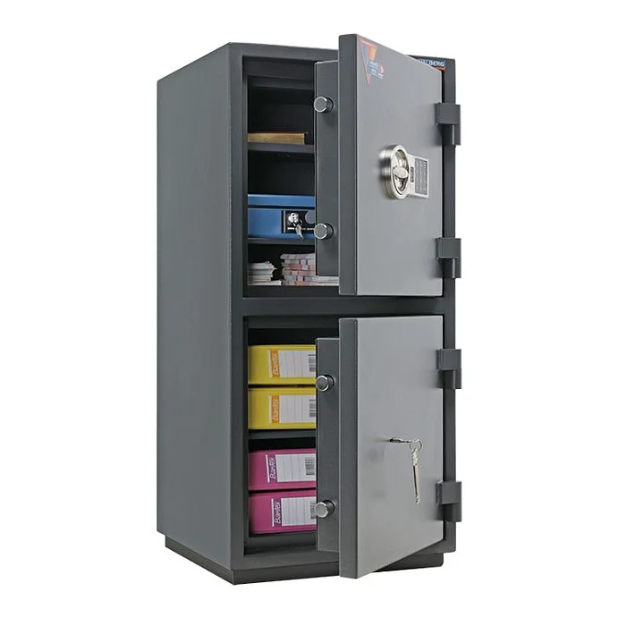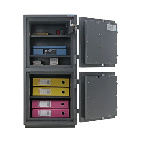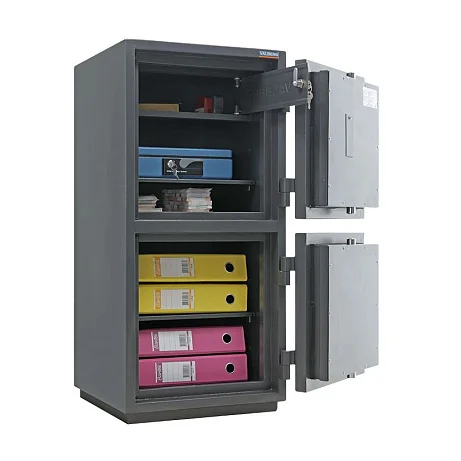 Сейф металлический с очень толстыми стенками и лицевыми панелями. Он имеет два отдельных отделения, каждое из которых закрывается своей дверью. При этом верхнее отделение закрывается дверью с кодовым электронным замком, нижнее – дверью с ключевым замком. Сейф можно прикрепить к полу, но для этого надо купить анкерный болт, которого нет в комплекте к этой модели сейфа. Приобрести такой сейф с двумя отделениями можно в любое время в Москве в магазине МедМебель по выгодной цене и с быстрой доставкой в любой регион.